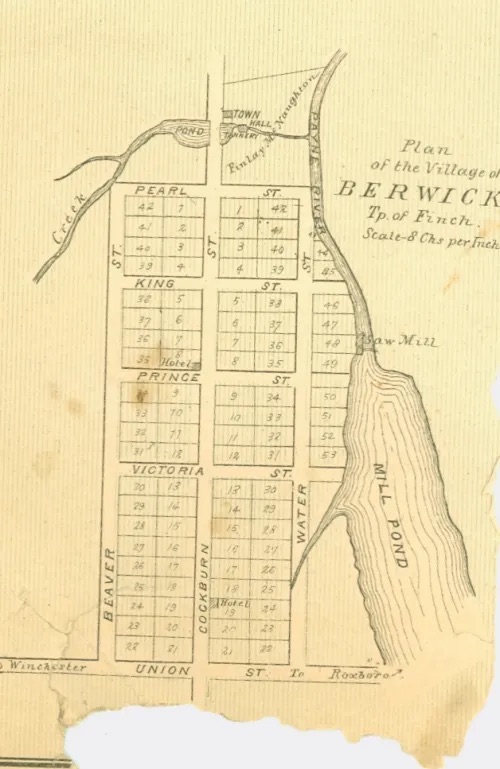Nearby, the Berwick Town Hall was constructed and is shown on the early map just east of the tannery off Cockburn Street. In 1850 Berwick became the Finch Township municipal centre and the Town Hall was used for township meetings and administrative purposes.