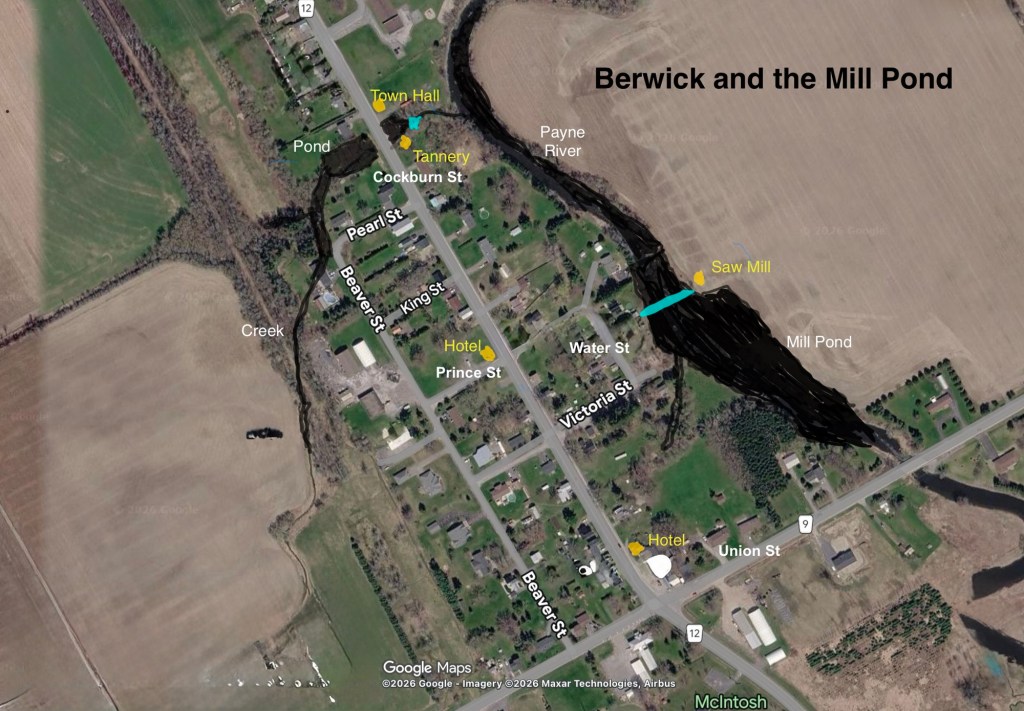 Recently someone asked me where the mill pond was in Berwick, Ontario, a little community about three kilometers south of where I live in Crysler. I pass through that community regularly, but I have never imagined there had been a pond there at any time.