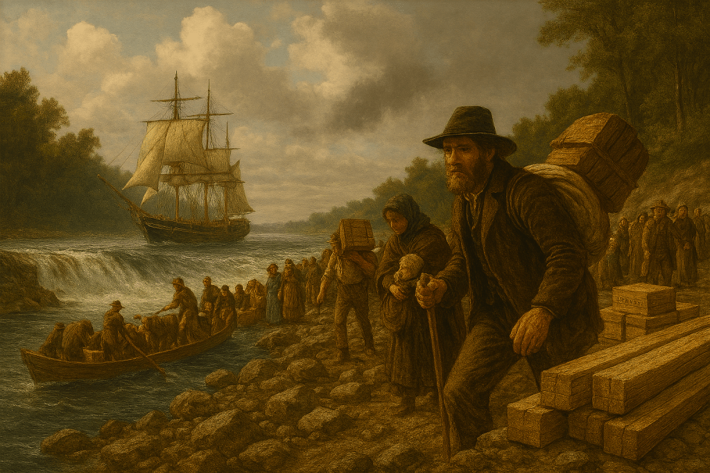 To reach Kirk Hill, Allan (Glen‑Payne) MacMillan’s settlers had to row and haul batteaux up the St. Lawrence, portage around dangerous rapids, land at Cornwall, and then walk for days on modest trails through unbroken forest. Only then did they reach the Highland community at Kirk Hill — the first foothold for the families who would later begin their new immigrant life as residents of the area near Finch and Berwick.